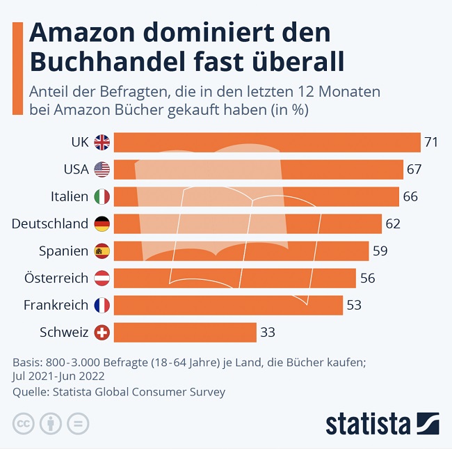 Eine neue Erhebung von Statista Global Consumer Survey zeigt, wie stark Amazon den Online-Buchhandel auch in Europa dominiert. In Deutschland gaben 62 Prozent der befragten Leserinnen und Leser an, in den letzten zwölf Monaten Bücher bei Amazon gekauft zu haben. In Österreich liegt Amazon gemäss Statista gleichauf mit Thalia. Die Schweiz nimmt im europäischen Vergleich eine Sonderrolle ein: Nur 33 Prozent der Befragten Lesenden bestellte in den letzten 12 Monaten ein Buch bei Amazon im deutschen Onlineshop – und das trotz Währungsvorteil und der vereinfachten Einfuhr seit dem Abkommen der Schweizer Post mit Amazon Ende 2018.