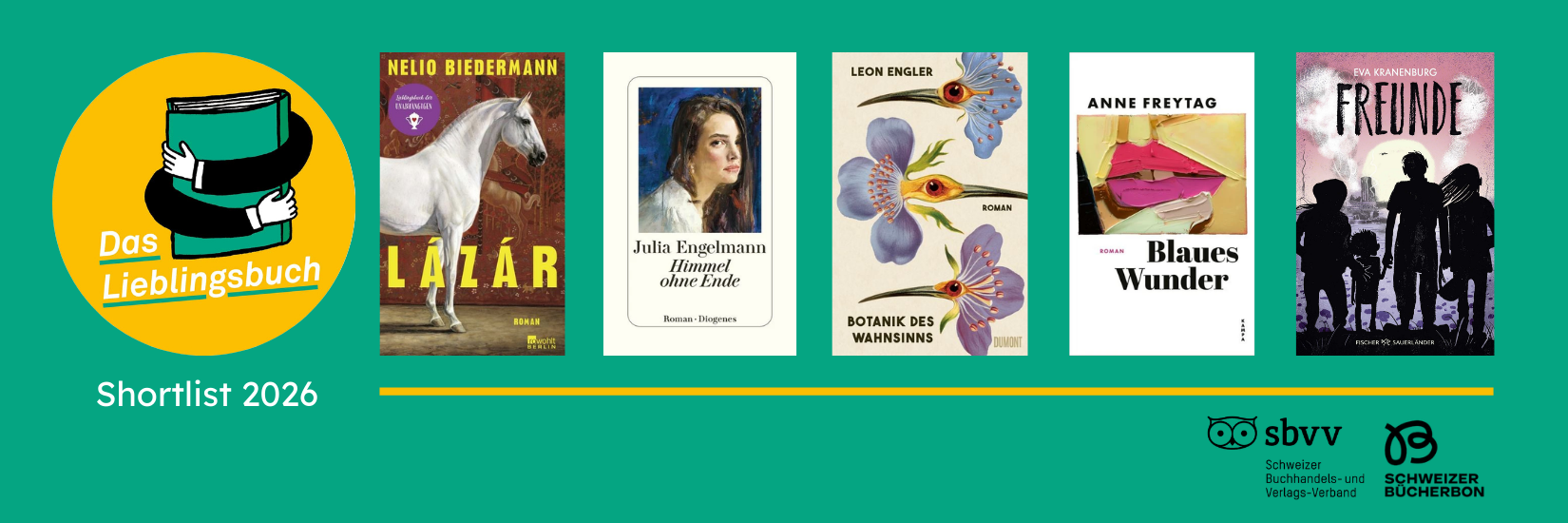 Die Suche nach dem Lieblingsbuch des Deutschweizer Buchhandels 2026 läuft auf Hochtouren. Vom 12. März bis am 9. April 2026 können Buchhändlerinnen und Buchhändler aus der Deutschschweiz ihr Lieblingsbuch aus der Shortlist der folgenden fünf Titel wählen: