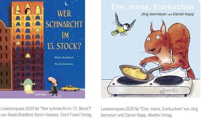 Lesekompass 2020: Zum 9. Mal ehren die Leipziger Buchmesse und die Stiftung Lesen 2020 herausragende Kinder- und Jugendliteratur in drei Alterskategorien 2 bis 6 Jahre / 6 bis 10 Jahre / 10 bis 14 Jahre. Hier geht es zur Übersicht der 30 Gewinnertitel (inkl. Material), die heute Mittag bekannt gegeben wurden. Aus Schweizer Verlagen wurden zwei Bilderbücher ausgezeichnet: Jörg Isermeyer/Daniel Napp (Illustration): Ene, mene, Eierkuchen im Atlantis Verlag sowie Wade Bradford/Kevin Hawkes (Illustration)/ Seraina Maria Sievi (Übersetzung): Wer schnarcht im 13. Stock? im Orell Füssli Verlag.