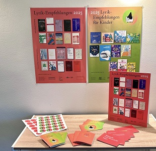Die Deutsche Akademie für Sprache und Dichtung stellt jedes Jahr zum Welttag der Poesie Werbematerial für die Lyrik-Empfehlungen für Kinder und Erwachsene bereit. 20 lyrische Neuerscheinungen der letzten zwölf Monate sowie elf Lyrik-Bücher für Kinder aus den Jahren 2024 und 2025 werden von Lyrik-Profis empfohlen. Eine Wendebroschüre präsentiert alle 31 Titel, zudem gibt es zwei verschiedene Plakate, Aufkleber sowie Postkarten.